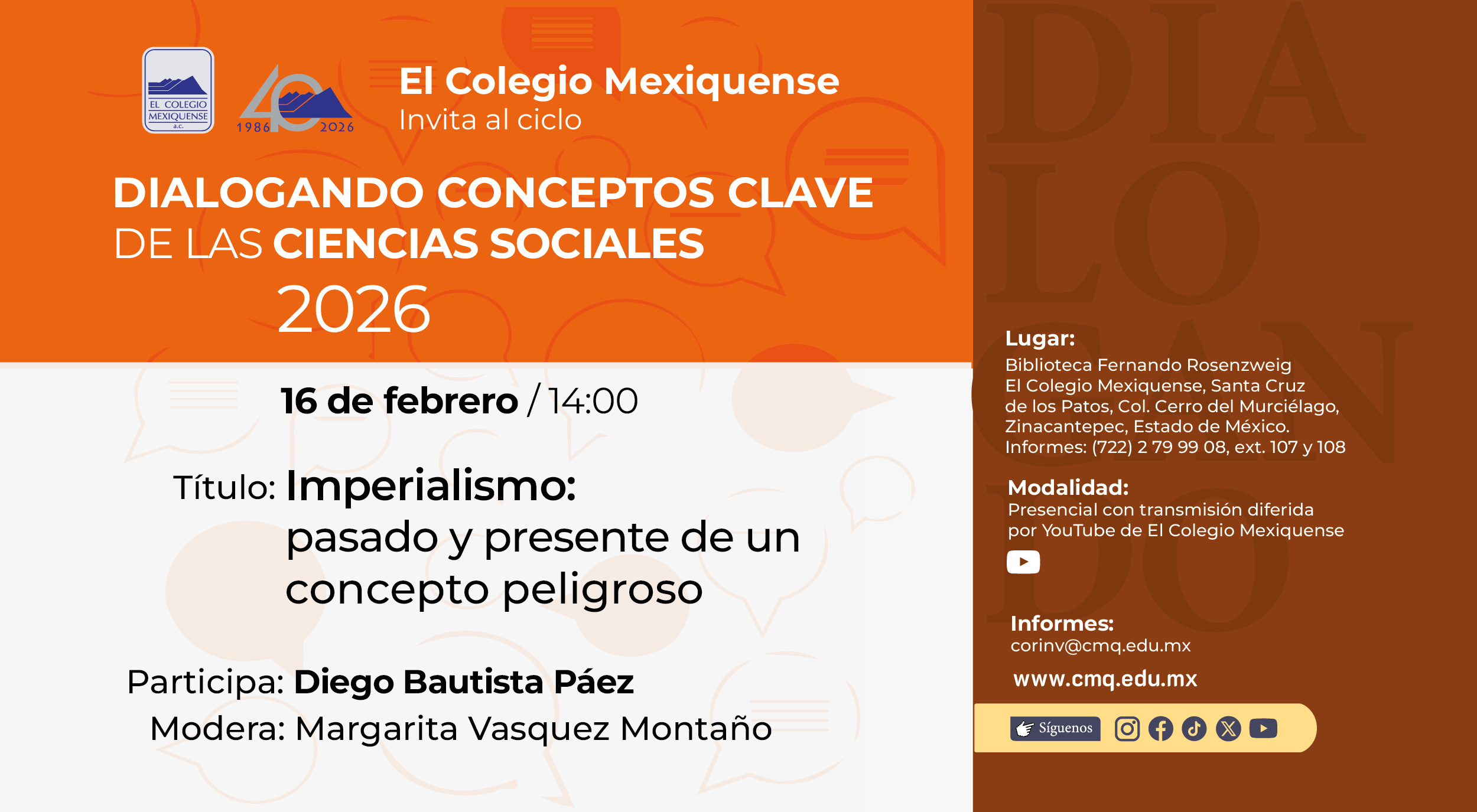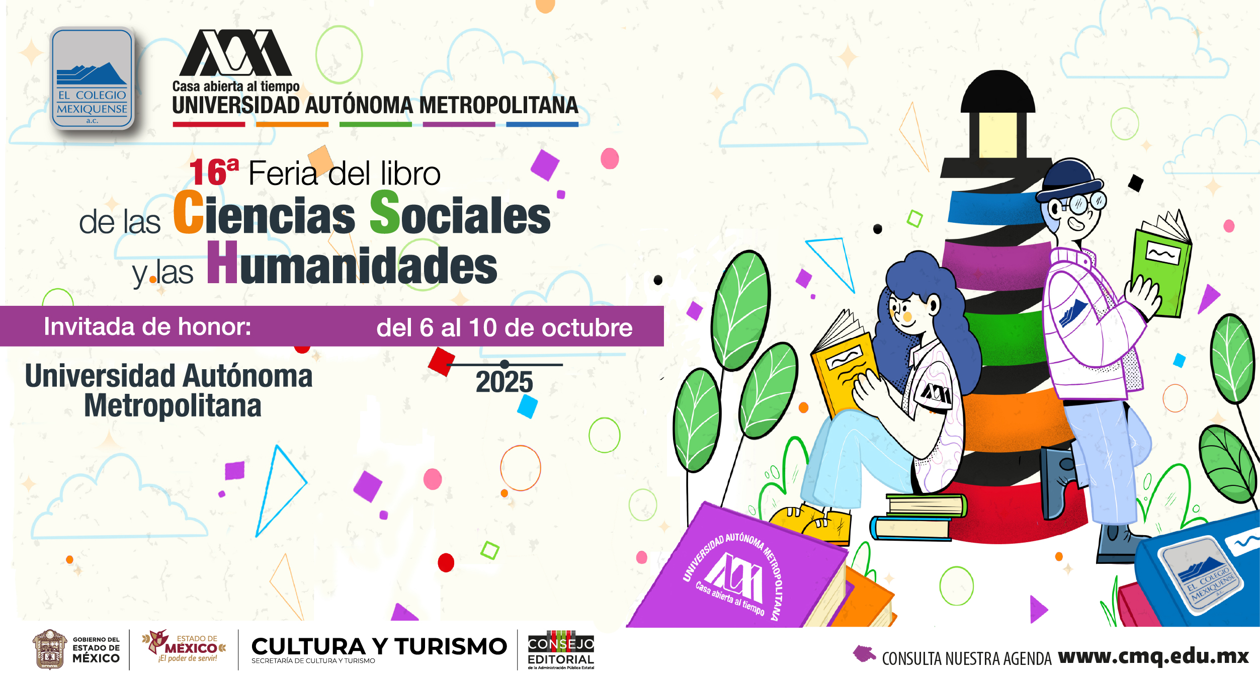 Del lunes 6 al viernes 10 de octubre, en Santa Cruz de los Patos, municipio de Zinacantepec, se llevará a cabo la 16ª Feria del Libro de las Ciencias Sociales y las Humanidades, organizada por El Colegio Mexiquense, con la Universidad Autónoma Metropolitana como invitada de honor y con una participación especial de la Unidad Lerma de esa casa académica.